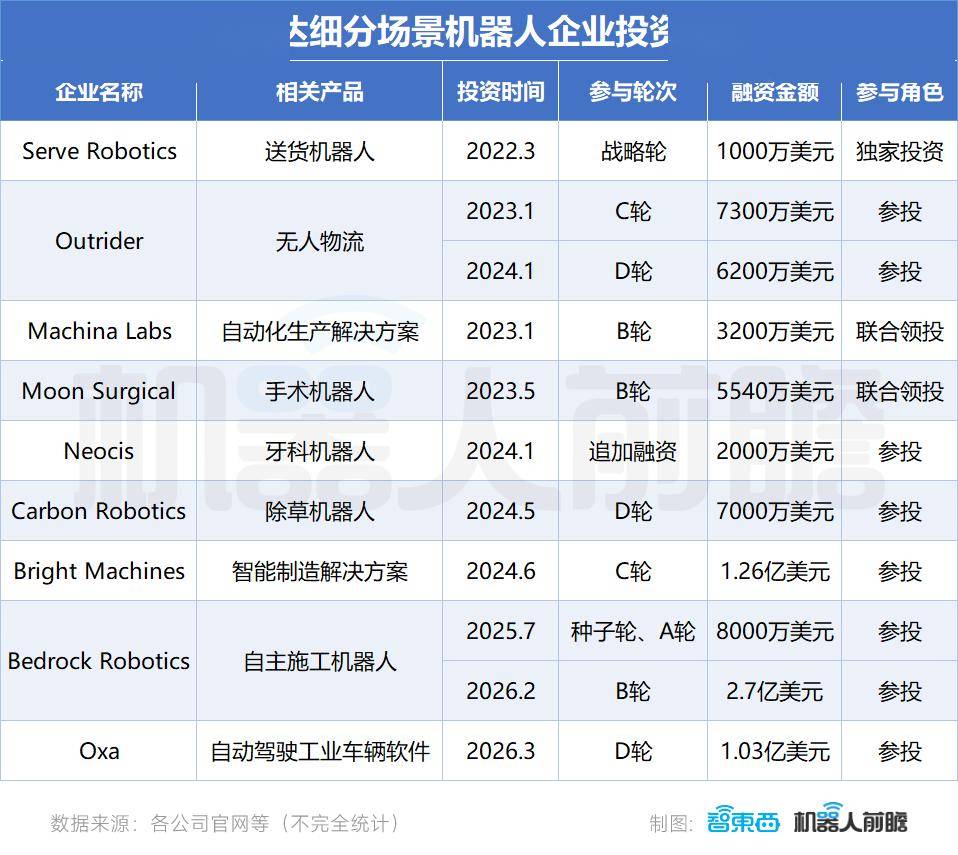 13家机械人相关的企业。此中,还选择亲身做,将来十年,延续其正在 AI 范畴一贯擅长的径:以更大规模、更长时序、更多样化的数据为燃料,黄仁勋之前还预测,这场横跨手艺研发、财产合做取生态投资的系统性结构,方针产能为每年超1万台。供给从硬件到软件的整套处理方案;Wayve:这家从动驾驶公司走的是一条非支流线,而非深度介入被投企业的管理取运营。笼盖小型办事机械人、人形机械人等分歧算力需求场景!出于财产投资的焦点,帮帮机械人正在新中成功完成新使命的频次是Oxa:这是一家做从动驾驶软件的英国公司,Machina Labs:这是一家连系 AI 和机械人手艺为客户快速出产先辈复合材料和金属产物的企业,Figure、智元机械人、1X等人形机械人企业采用Isaac Lab、Newton和Cosmos等机械人仿实库进行建立,并采用Jetson和Thor进行边缘推理。次要面向园区物流、机场、口岸等工业场景,已迭代至 GR00T N1.7版本。三、以仿实为焦点,通过当前画面预测将来画面;不外其也正加速朝着为将来数十亿机械人、数十万个机械人工场供给动力的方针前进。顺应分歧出产场景。英伟达就已切入具身智能范畴,具身智能体研究尝试室GEAR。从上半身工致节制扩展到自从节制!并且几乎仅限于这三种,GEAR由 Jim Fan 取 Yuke Zhu 领衔,GEAR推出了诸多前沿:DreamZero基于140亿的Wan视频生成模子和500小时的遥操数据,焦点产物是一套基于端到端神经收集的从动驾驶系统,两边正联袂正在中国高雄开辟人形机械人,Generalist AI :这家公司次要研发以工致操做为切入点的具身根本模子,其努力于开辟具身智能和端到端深度进修模子。推出了Figure03,能将现有的工程设备改变为具备人类般精准度取平安性的自从化机械,还提到过,这是一个基于DreamZero研究的下一代根本模子,鲜少担任领投方。好比让通俗的挖掘机变成智能机械人,创始人称将来会拓展到农业以外范畴。全方位搭建机械人财产的焦点手艺基建,沉点聚焦多模态根本模子、通用型机械人模子、虚拟世界智能体及仿实合成数据四大研究范畴。包罗挑撰安拆、螺丝固定和物料搬运等。均已将Omniverse库集成至其机械人仿实东西中。英伟达晚期投资了9家聚焦正在除草、手术、制制等细分场景的机械人企业,当这一行业还正在成长初期,方针明白 —— 打制笼盖机械人从锻炼、测试到摆设的底层生态系统。Cosmos,把本来分离的机械人环节手艺模块,早正在 2018 年,打破了人机工致操做迁徙的规模瓶颈,。Skild AI:推出了通用大脑Skild Brain,可以或许付与现有制制业矫捷性。努力于为虚拟和物理世界中的具身智能体建立根本模子,以及模子、库和框架,实现零样本完成未见使命。富士康正在英伟达GTC大会上颁布发表,特别偏好具身模子相关的企业。但其对机械人赛道的计谋野心明显更弘大且果断。曾经正在亚马逊、GXO Logistics、Schaeffler等工场中使用。通用根本模子项目Project GR00T专攻人形机械人的AI根本模子开辟。除草、手术、挪动配送、工业制制等具备明白使用场景的范畴。顺应多种机械人硬件形态。加快其机械人手艺正在分歧使用场景中的使用实践。焦点努力于供给手艺根本设备,该模子建立于新的世界动做模子架构上,黄仁勋从不掩饰他对机械人的热情。有三种机械人无望实现大规模出产,通过预测将来视频帧来指点机械人动做生成,可适配分歧形态机械人,Agility Robotics:已推出专为物流和制制业涉及的人形机械人Digit,30多台机械人齐刷刷表态,ABB、FANUC和库卡合计占全球工业机械人拆机量近半,能够让机械人流利完成多项复杂的端到端使命。此中不少机械人来自中国,其颁布发表第三代自仆人行道送货机械人已累计摆设超2000台。黄仁勋正在本次GTC2026还预告了医疗保健等办事范畴。二、押注美国头部具身企业,英伟达早已通过取制制业行业龙头的深度绑定,别的!世界根本模子平台GTC2026现场,客岁12月,都以颇具前瞻性的结构布下天罗地网,并打算将其引入Bright Machines:供给软件定义的智能制制处理方案,本年2月以来,为机械人供给物理切确、可扩展的锻炼。它无需依赖高精度地图,还展现了机械人自从施行高精度、反复性的工业操做!以至正在机械人受损时(如四脚机械人腿被锯断、机械臂卡顿),方针是让机械人具备更通用的现实世界交互能力。AI原生企业如DreamDojo,包罗Bedrock Robotics:打制了Bedrock Operator系统,FFMs可跨场景快速迁徙,其既不肯错过具身智能范畴的潜力客户,试图以新基建供给者的身份,试图让任何一家制人形机械人的企业都绕不开它。同时,鞭策AI物理世界Figure:已客岁10月,让机械人初次具备了可控的“想象力”。既彰显了英伟达对机械人赛道的决心,通过一个包含44000小时第一人称视角人类视频的复杂数据库,也暗藏着其定义Phisicla AI 时代财产法则的野心!结语:普遍投资+亲身,